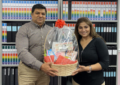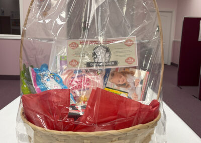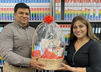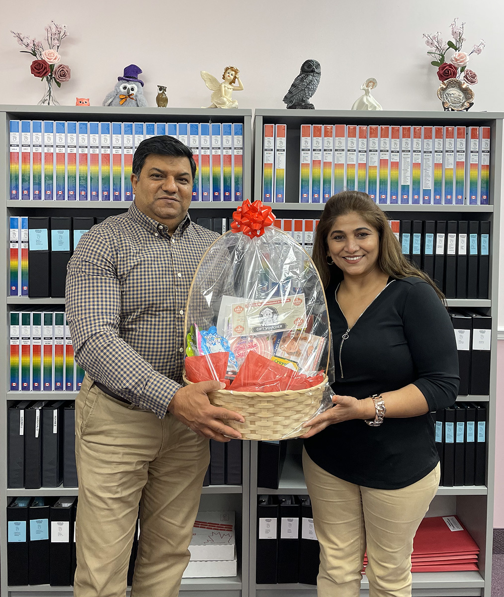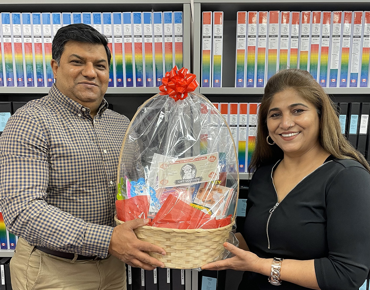 The directors, Sandeep and Sangeeta, were happy to give a basket containing preschool educational materials and a voucher for a free skill level evaluation and 5 free lessons!