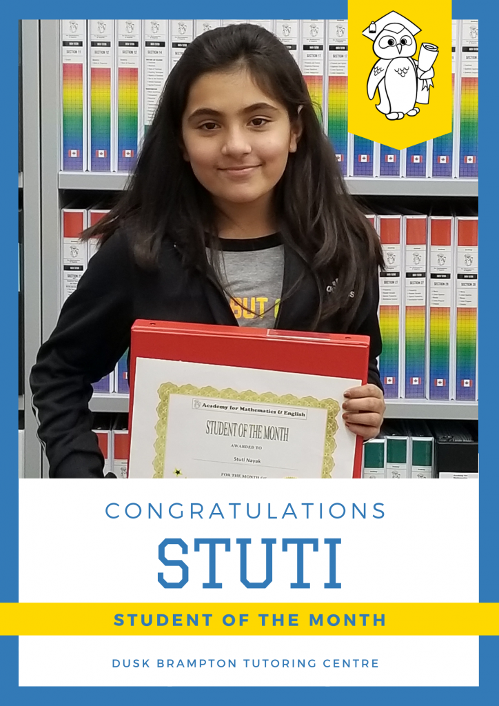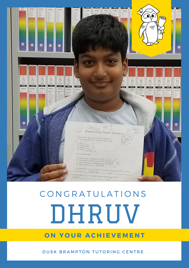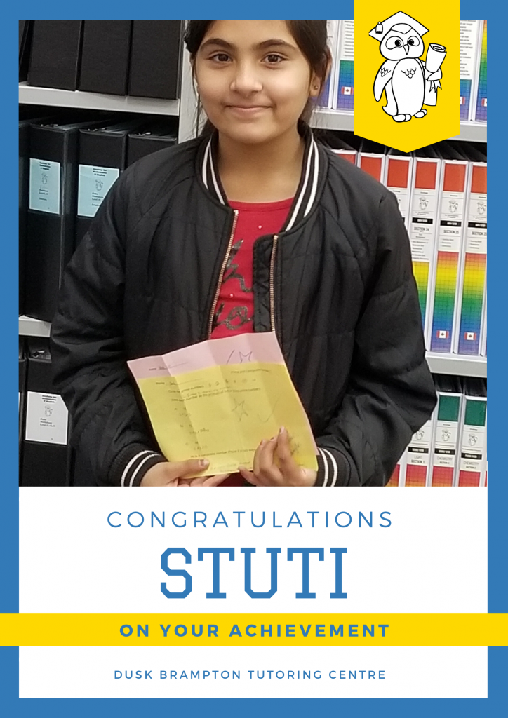 She is an enthusiastic and motivated learner. Tutors at Dusk Brampton are very impressed with her improvement in English & Mathematics! Her abilities in math have increased tremendously, and we hope to see her continue progressing in the future!”
